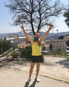 Una storia bellissima, fatta di cuore, amo- re e passione. Quella di Fabio Faggiani, 35 anni da Allumiere, centro collinare a pochi chilometri da Roma. Podista per diletto, iscritto alla Società Airone Monti della Tolfa, che ha raccolto e fatto suo l’incito su internet a raccontare le proprie performance casalinghe, in questo tragico periodo di quaran- tena, e stimolare gli altri runner. Rimanendo rigorosamente in casa.