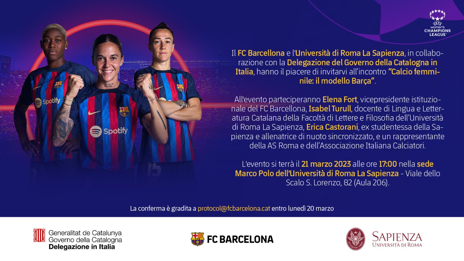 L’appuntamento è per martedì 21 alle ore 17, a poche ore dalla sfida di Champions League femminile tra Roma e Barcellona (stadio Olimpico, ore 21), all’Università della Sapienza dove si terrà una tavola rotonda che verterà sul ruolo della donna nel gioco del calcio e il modello di successo sportivo e sociale della squadra femminile del Barça. Sarà coordinato dalla professoressa Maria Cristina Limatola, prorettrice per lo Sport e benessere dell’Università La Sapienza di Roma. Parteciperanno la vicepresidente istituzionale del Futbol Club Barcelona Elena Fort, la professoressa Isabel Turull, docente di Lingua e Letteratura Catalana della Facoltà di Lettere e Filosofia dell’Università di Roma La Sapienza, Fabio Appetiti, responsabile delle relazioni istituzionali dell’Associazione Italiana Calciatori e Consigliere della Divisione Calcio Femminile FIGC, il Delegato del Governo della Catalogna in Italia, Luca Bellizzi, ed Erica Castorani, ex studentessa della Sapienza e allenatrice di nuoto sincronizzato.