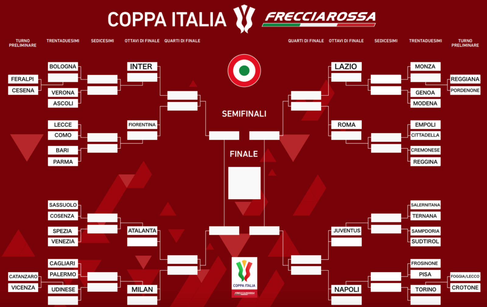 Con la chiusura del campionato di Serie A, e tenendo conto del regolamento del torneo, è già possibile delineare il tabellone della Coppa Italia 2023/24e farsi suggestionare dai possibili incroci. Considerando anche il turno preliminare vi prenderanno parte 44 squadre in tutto, con le 8 teste di serie (che cominceranno il loro cammino agli ottavi) già definite: ai quarti di finale potrebbe andare in scena il derby di Roma, in semifinale quello di Milano, mentre Juve-Inter sarebbe possibile solamente nella finalissima.